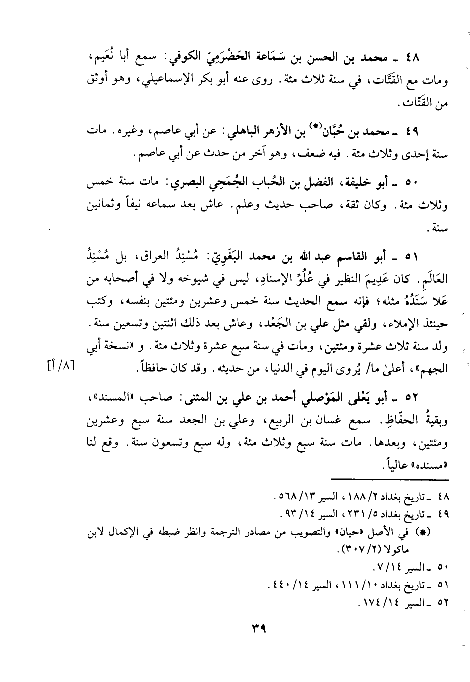 50- أبو خليفة، الفضل بن الحباب الجمحي البصري: مات سنة خمس وثلاث مئة. وكان ثقة، صاحب حديث وعلم. عاش بعد سماعه نيفاً وثمانين سنة.