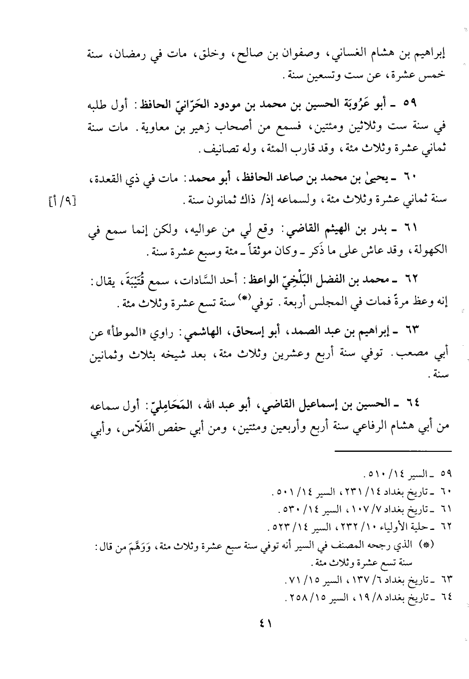 59- أبو عروبة الحسين بن محمد بن مودود الحراني الحافظ: أول طلبه في سنة ست وثلاثين ومئتين، فسمع من أصحاب زهير بن معاوية. مات سنة ثماني عشرة وثلاث مئة، وقد قارب المئة، وله تصانيف.