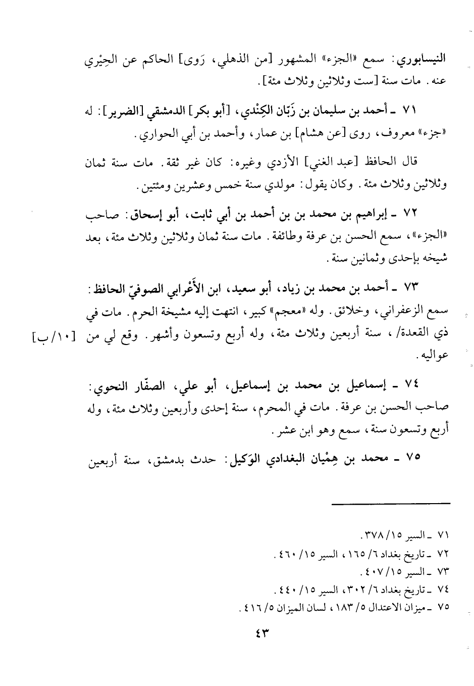 74- إسماعيل بن محمد بن إسماعيل، أبو علي، الصفار النحوي: صاحب الحسن بن عرفة. مات في المحرم، سنة إحدى وأربعين وثلاث مئة، وله أربع وتسعون سنة، سمع وهو ابن عشر.