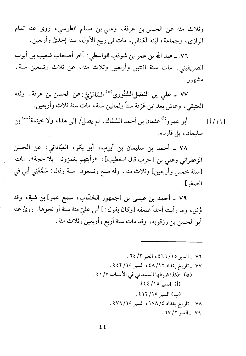 77- علي بن الفضل الستوري السامري: عن الحسن بن عرفة. وثقه العتيقي، وعاش بعد ابن عرفة ستاً وثمانين سنة، مات سنة ثلاث وأربعين.