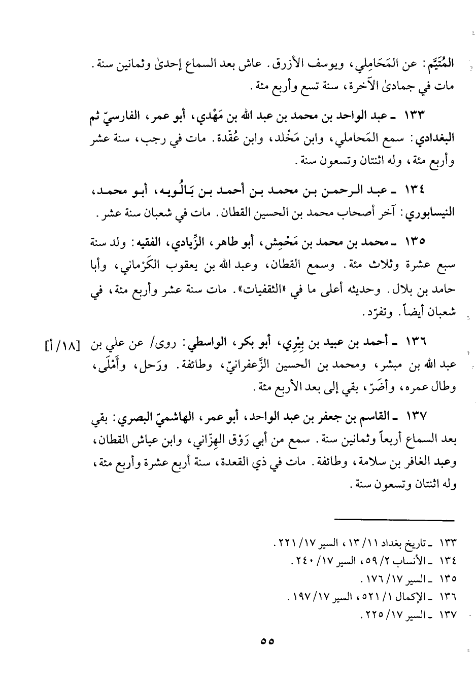 134- عبد الرحمن بن محمد بن أحمد بن بالويه، أبو محمد، النيسابوري: آخر أصحاب محمد بن الحسين القطان. مات في شعبان سنة عشر.
