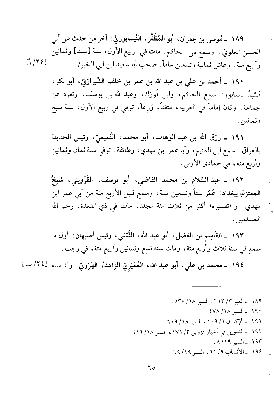 189- موسى بن عمران، أبو المظفر، النيسابوري: آخر من حدث عن أبي الحسن العلوي. وسمع من الحاكم. مات في ربيع الأول، سنة [ست] وثمانين وأربع مئة. وعاش ثمانية وتسعين عاماً. صحب أبا سعيد ابن أبي الخير.