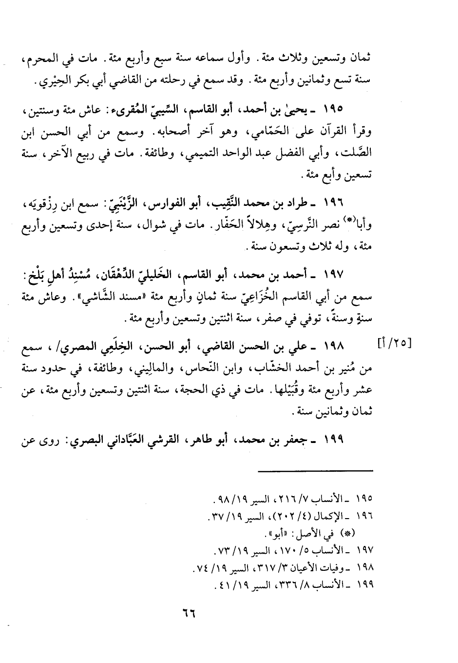 196- طراد بن محمد النقيب، أبو الفوارس، الزينبي: سمع ابن رزقويه، وأبا نصر النرسي، وهلالاً الحفار. مات في شوال، سنة إحدى وتسعين وأربع مئة، وله ثلاث وتسعون سنة.