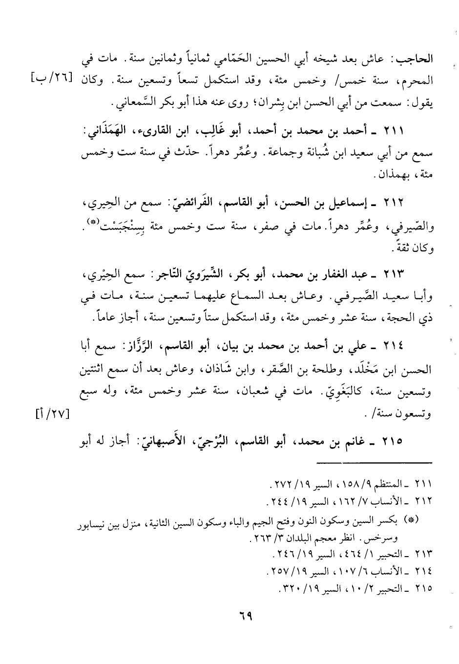الحاجب: عاش بعد شيخه أبي الحسين الحمامي ثمانياً وثمانين سنة. مات في المحرم، سنة خمس وخمس مئة، وقد استكمل تسعاً وتسعين سنة. وكان يقول: سمعت من أبي الحسن ابن بشران؛ روى عنه هذا أبو بكر السمعاني.