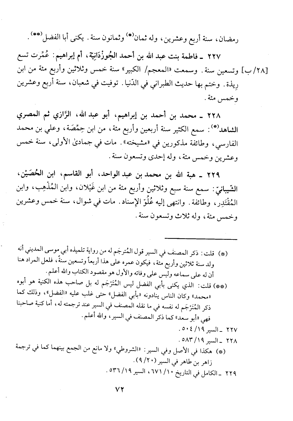 227- فاطمة بنت عبد الله بن أحمد الجوزدانية، أم إبراهيم: عمرت تسع وتسعين سنة. وسمعت ((المعجم الكبير)) سنة خمس وثلاثين وأربع مئة من ابن ريذة. وختم بها حديث الطبراني في الدنيا. توفيت في شعبان، سنة أربع وعشرين وخمس مئة.