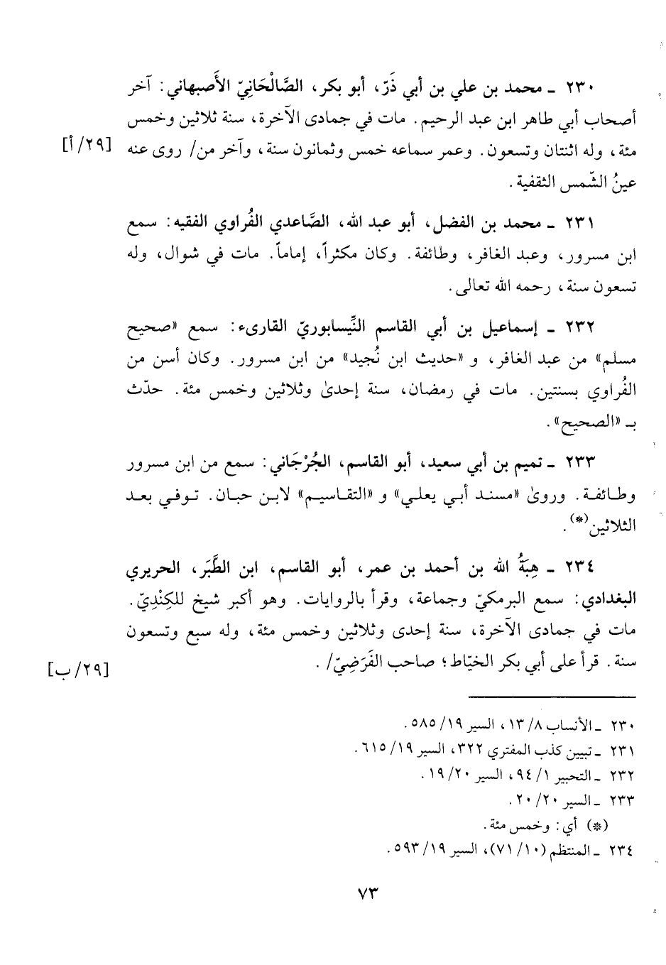 230- محمد بن علي بن أبي ذر، أبو بكر، الصالحاني الأصبهاني: آخر أصحاب أبي طاهر ابن عبد الرحيم. مات في جمادى الآخرة، سنة ثلاثين وخمس مئة، وله اثنتان وتسعون. وعمر سماعه خمس وثمانون سنة، وآخر من روى عنه عين الشمس الثقفية.