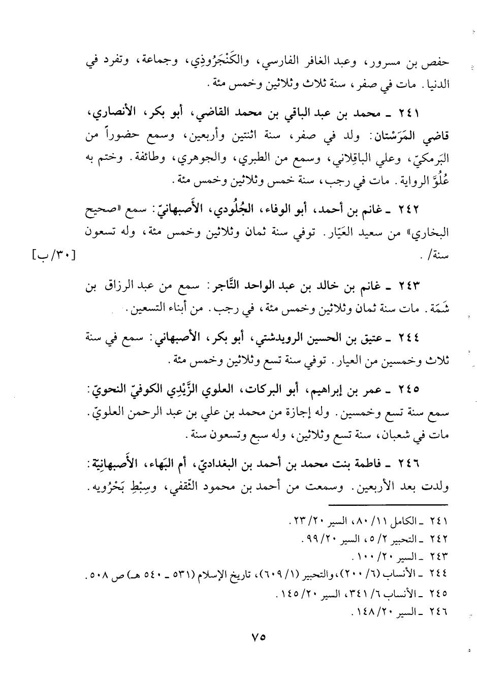 242- غانم بن أحمد، أبو الوفاء، الجلودي، الأصبهاني: سمع ((صحيح البخاري)) من سعيد العيا. توفي سنة ثمان وثلاثين وخمس مئة، وله تسعون سنة.
