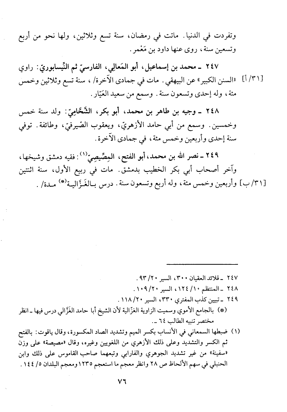 249- نصر الله بن محمد، أبو الفتح، المصيصي: فقيه دمشق وشيخها، وآخر أصحاب أبي بكر الخطيب بدمشق. مات في ربيع الأول، سنة اثنتين وأربعين وخمس مئة، وله أربع وتسعون سنة. درس بالغزالية مدة.