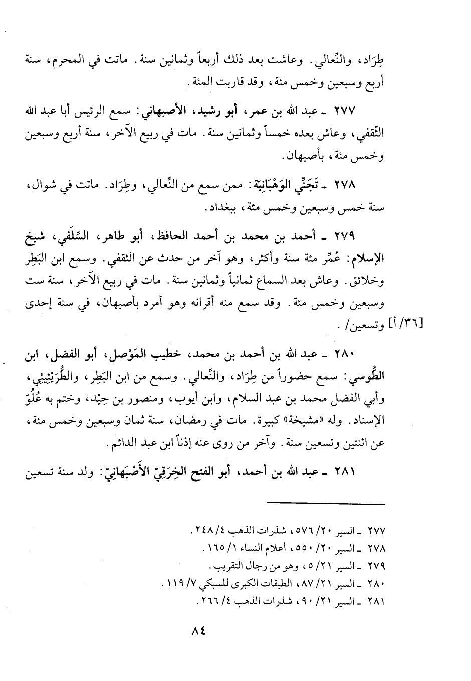 279- أحمد بن محمد بن أحمد الحافظ، أبو طاهر، السلفي، شيخ الإسلام: عمر مئة سنة وأكثر، وهو آخر من حدث عن الثقفي. وسمع ابن البطر وخلائق. وعاش بعد السماع ثمانياً وثمانين سنة. مات في ربيع الآخر، سنة ست وسبعين وخمس مئة. وقد سمع منه أقرانه وهو أمرد بأصبهان، في سنة إحدى وتسعين.