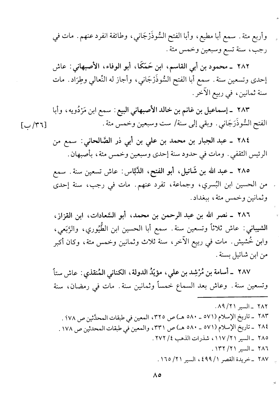 287- أسامة بن مرشد بن علي، مؤيد الدولة، الكناني المنقذي: عاش ستاً وتسعين سنة. وعاش بعد السماع خمساً وثمانين سنة. مات في رمضان، سنة