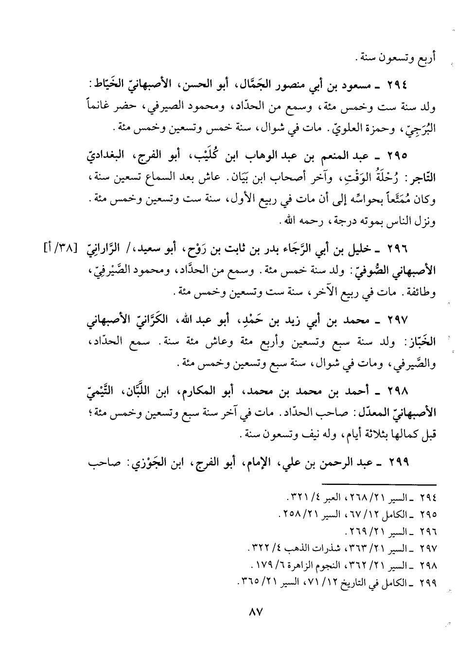 294- مسعود بن أبي منصور الجمال، أبو الحسن، الأصبهاني الخياط: ولد سنة ست وخمس مئة، وسمع من الحداد، ومحمود الصيرفي، حضر غانماً البرجي، وحمزة العلوي. مات في شوال، سنة خمس وتسعين وخمس مئة.