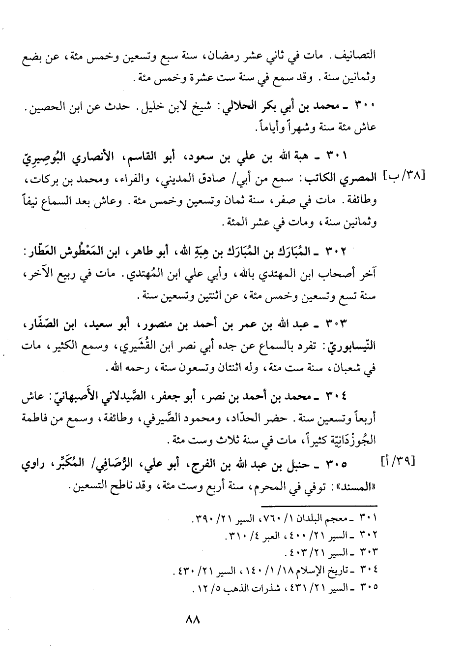 304- محمد بن أحمد بن نصر، أبو جعفر، الصيدلاني الأصبهاني: عاش أربعاً وتسعين سنة. حضر الحداد، ومحمود الصيرفي، وطائفة، وسمع من فاطمة الجوزدانية كثيراً مات في سنة ثلاث وست مئة.