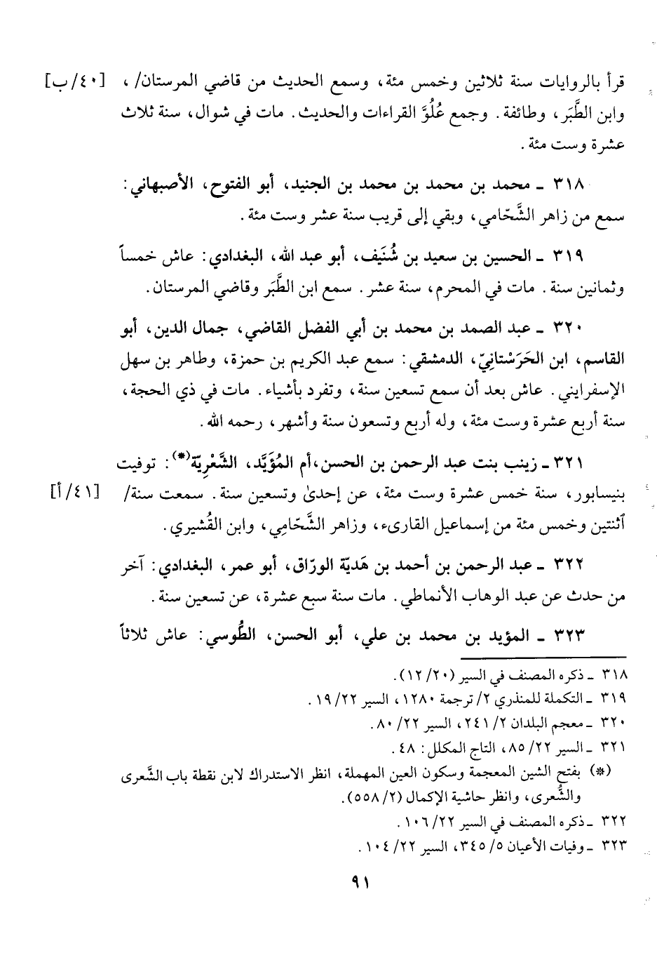 321- زينب بنت عبد الرحمن بن الحسن، أم المؤيد، الشعرية: توفيت بنيسابور، سنة خمس عشرة وست مئة، عن إحدى وتسعين سنة. سمعت سنة اثنتين وخمس مئة من إسماعيل القارئ، وزاهر الشحامي، وابن القشيري.