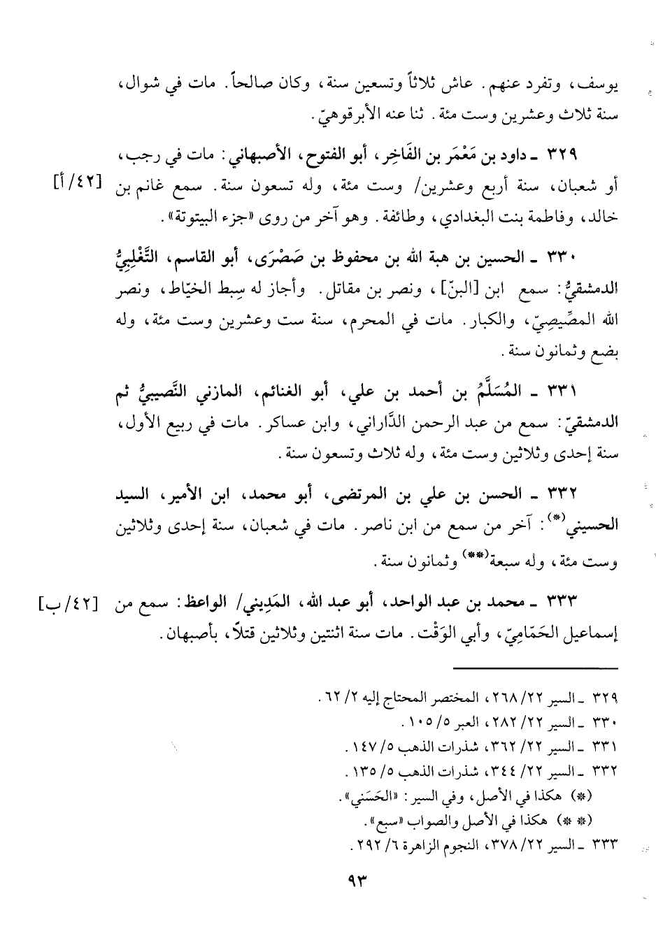 329- داود بن معمر بن الفاخر، أبو الفتوح الأصبهاني: مات في رجب أو شعبان، سنة أربع وعشرين وست مئة، وله تسعون سنة. سمع غانم بن خالد، وفاطمة بنت البغدادي، وطائفة. وهو آخر من روى ((جزء البيتوتة)).