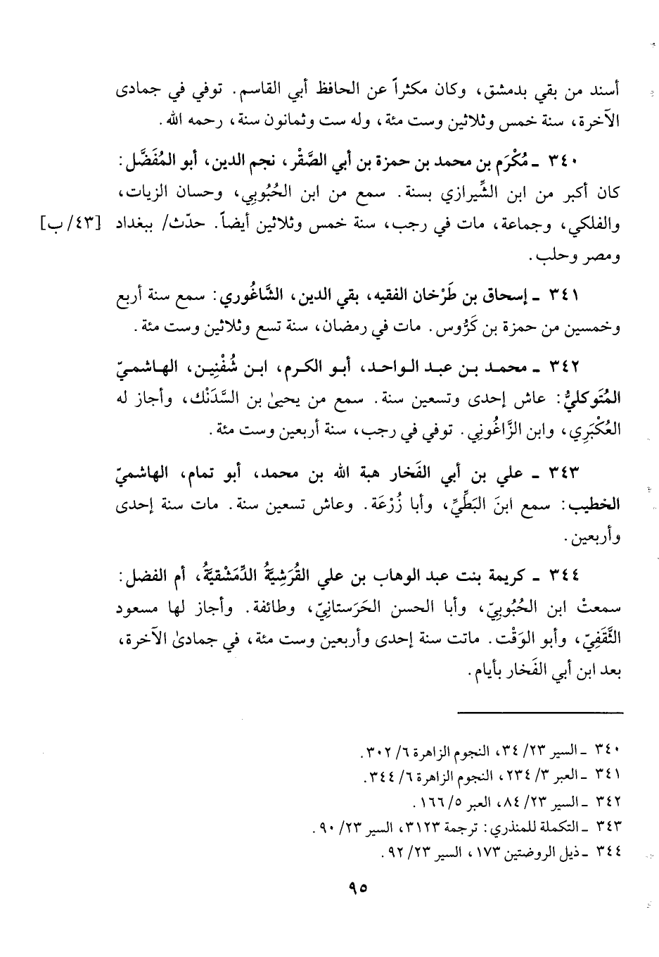 340- مكرم بن محمد بن حمزة بن أبي الصقر، نجم الدين، أبو المفضل: كان أكبر من ابن الشيرازي بسنة. سمع من ابن الحبوبي، وحسان الزيات، والفلكي، وجماعة، مات في رجب، سنة خمس وثلاثين أيضاً. حدث ببغداد ومصر وحلب.