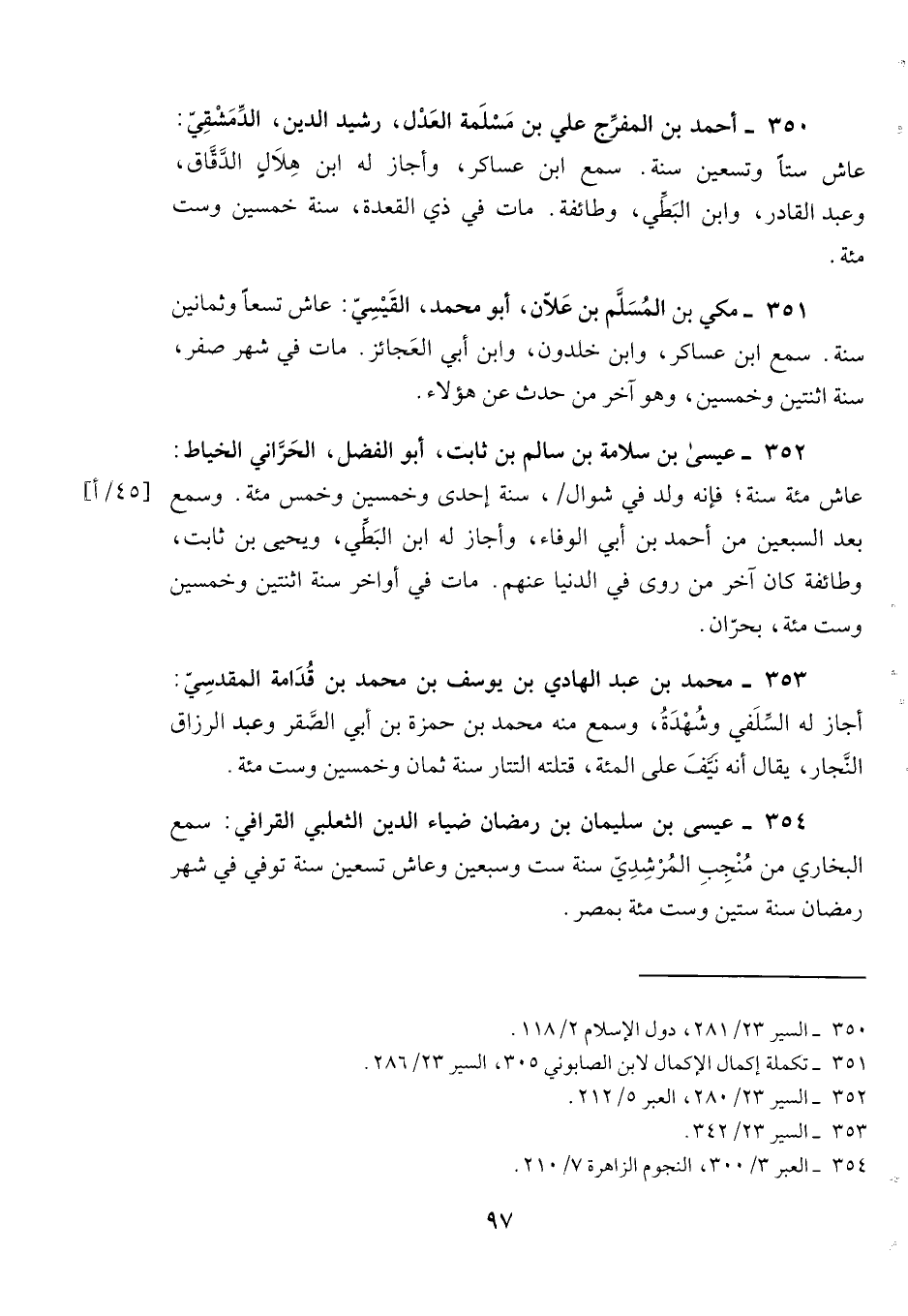 350- أحمد بن المفرج علي بن مسلمة العدل، رشيد الدين، الدمشقي: عاش ستاً وتسعين سنة. سمع ابن عساكر، وأجاز له ابن هلالٍ الدقاق، وعبد القادر، وابن البطي، وطائفة. مات في ذي القعدة، سنة خمسين وست مئة.