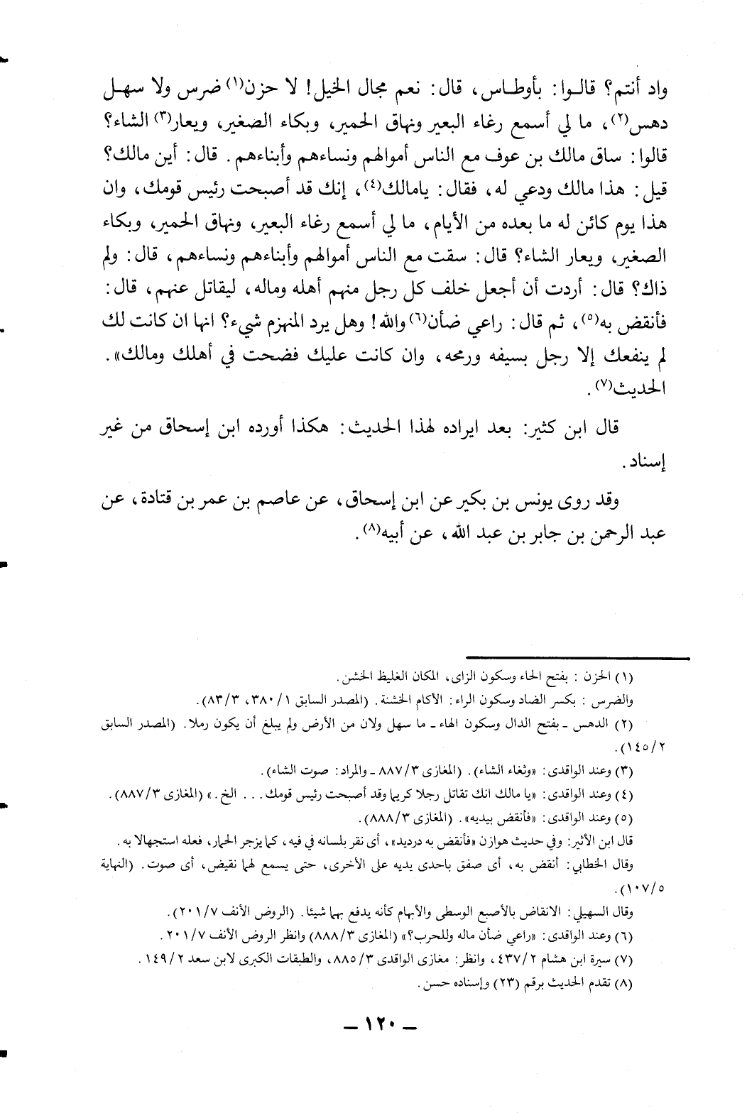 واد أنتم؟ قالوا: ب أوطاس، قال: نعم مجال الخيل! لا حزن1 ضرس ولا سهل دهس2، ما لي أسمع رغاء البعير ونهاق الحمير، وبكاء الصغير، ويعار3 الشاء؟ قالوا: ساق مالك بن عوف مع الناس أموالهم ونساءهم وأبناءهم. قال: أين مالك؟ قيل: هذا مالك ودعي له، فقال: يا مالك4، إنك قد أصبحت رئيس قومك، وإن هذا يوم كائن له ما بعده من الأيام، ما لي أسمع رغاء البعير ونهاق الحمير، وبكاء الصغير، ويعار الشاء؟ قال: سقت مع الناس اموالهم، وأبناءهم، ونساءهم، قال: ولِمَ ذاك؟ قال: أردت أن أجعل خلف كل رجل منهم أهله وماله، ليقاتل عنهم، قال: فأنقض به5، ثم قال: راعي ضأن6 والله! وهل يرد المنهزم شيء؟ إنها إن كانت لك لم ينفعك إلا رجل بسيفه ورمحه، وإن كانت عليك فضحت في أهلك ومالك" الحديث7.