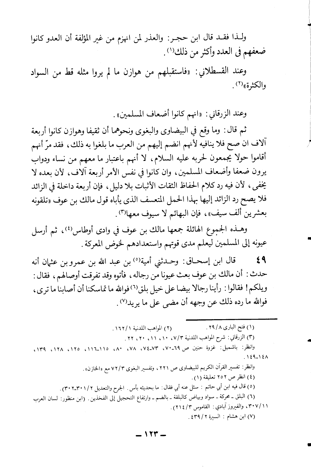 ثم قال: "وما وقع في البيضاوي والبغوي ونحوهما أن ثقيفا وهوازن كانوا أربعة آلاف إن صح فلا ينافيه لأنهم انضم إليهم من العرب ما بلغوا به ذلك، فقد مر أنهم أقاموا حولا يجمعون لحربه عليه السلام لا أنهم باعتبار ما معهم من نساء ودواب يرون ضعفا وأضعاف المسلمين، وإن كانوا في نفس الأمر أربعة آلاف، لأن بعده لا يخفى؛ لأن فيه رد كلام الحفاظ الثقات الأثبات بلا دليل، فإن أربعة داخلة في الزائد فلا يصح رد الزائد إليها بهذا الحمل المتعسف الذي يأباه قول مالك بن عوف "تلقونه بعشرين ألف سيف". فإن البهائم لا سيوف معها3.