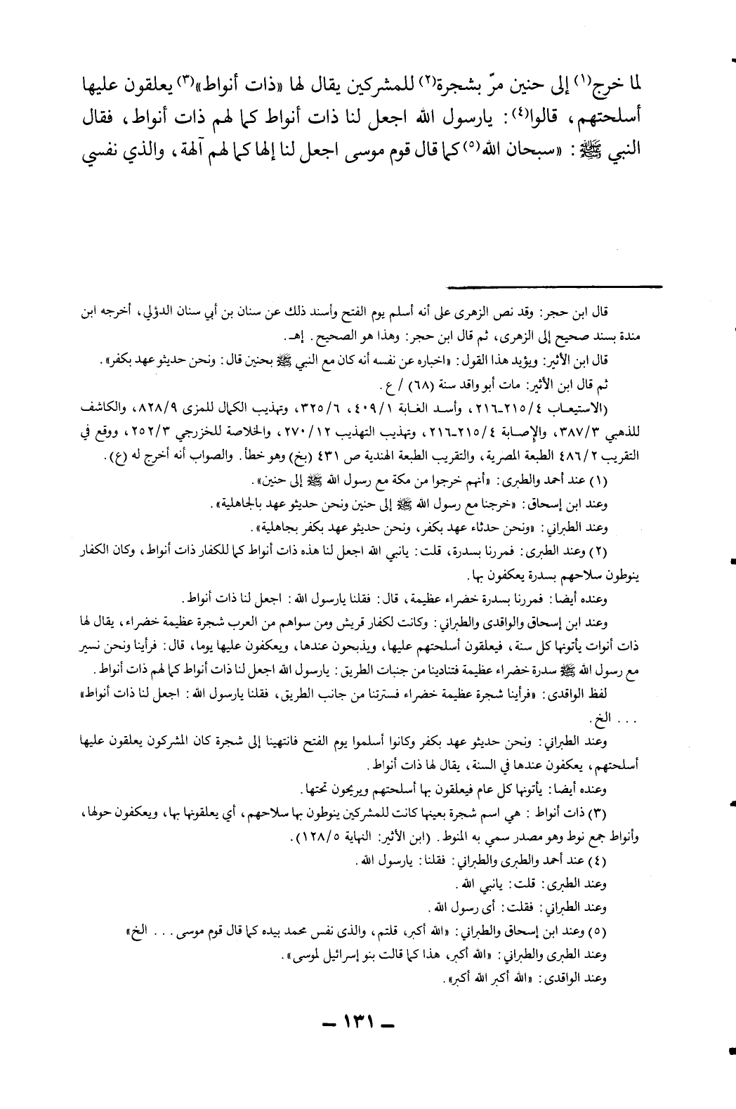 2 وعند الطبري: فمررنا بسدرة، قلت: يا نبي الله اجعل لنا هذه ذات أنواط كما للكفار ذات أنواط، وكان الكفار ينوطون سلاحهم بسدرة يعكفون بها.