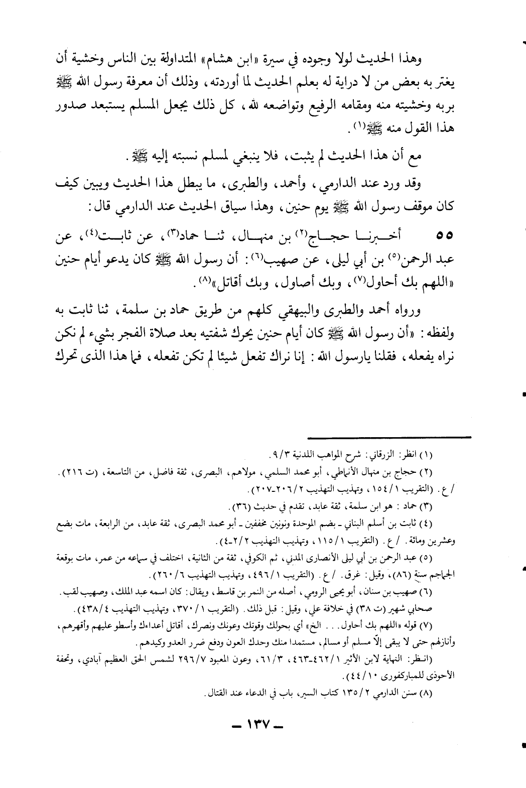 وقد ورد عند الدارمي، وأحمد، والطبري، ما يبطل هذا الحديث ويبين كيف كان موقف رسول الله - صلى الله عليه وسلم - يوم حنين، وهذا سياق الحديث عن الدارمي قال: