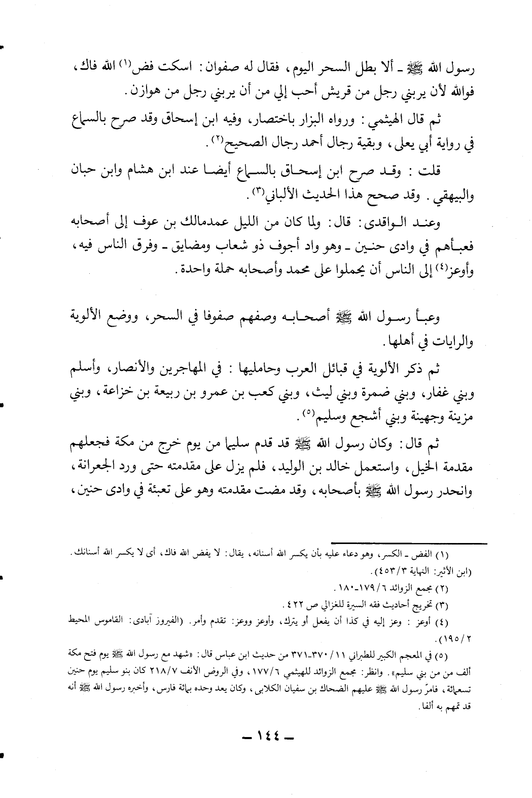 رسول الله - صلى الله عليه وسلم – ألا بطل السحر اليوم، فقال له صفوان: اسكت فض1 الله فاك، فوالله لأن يربني رجل من قريش أحب إلي من أن يربني رجل من هوازن.