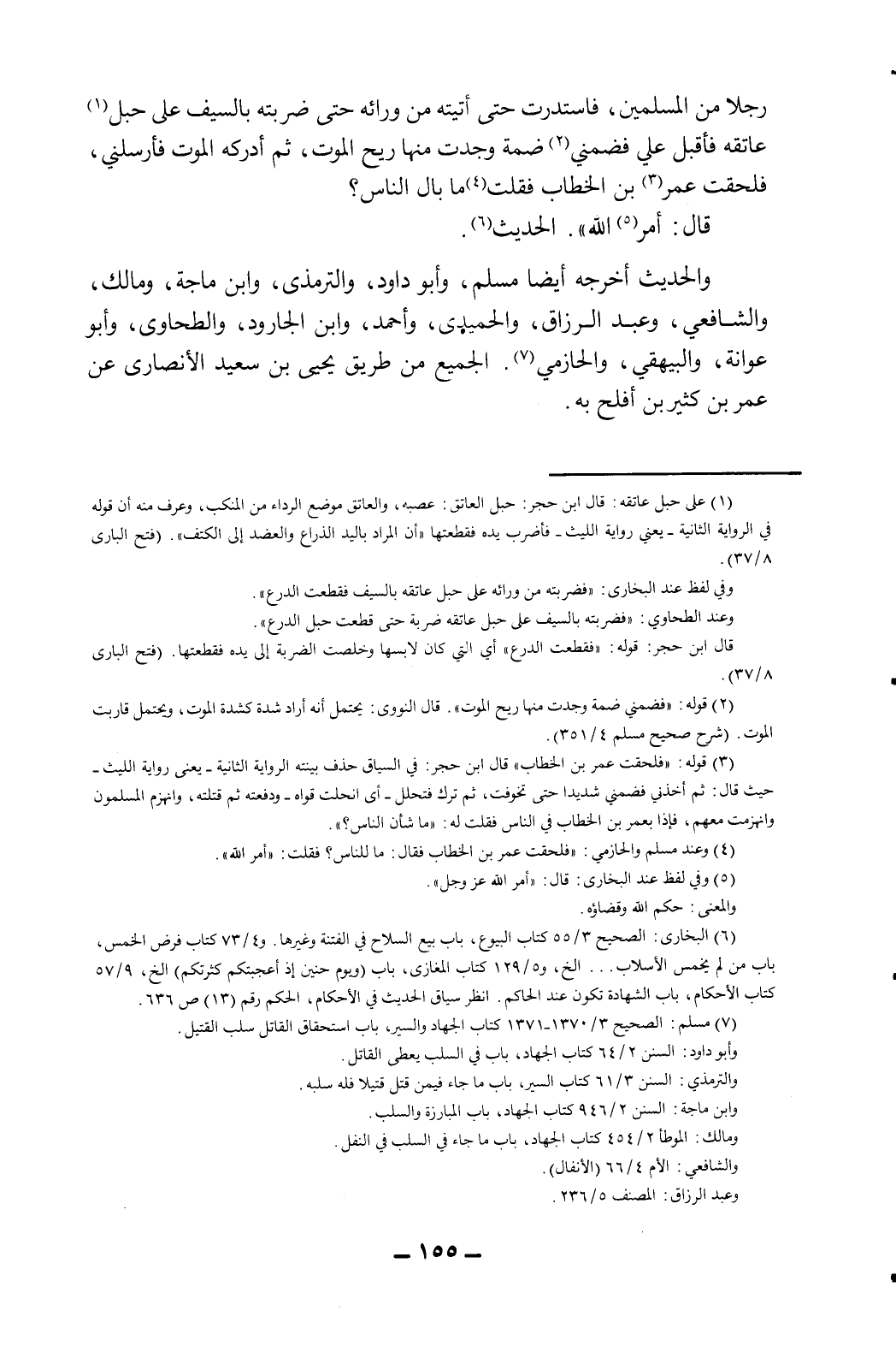 رجلا من المسلمين، فاستدرت حتى أتيته من ورائه حتى ضربته بالسيف على حبل1 عاتقه، فأقبل علي فضمني2 ضمة وجدت منها ريح الموت، ثم أدركه الموت فأرسلني، فلحقت عمر3 بن الخطاب فقلت4 ما بال الناس؟ قال: "أمر5 الله". الحديث6.