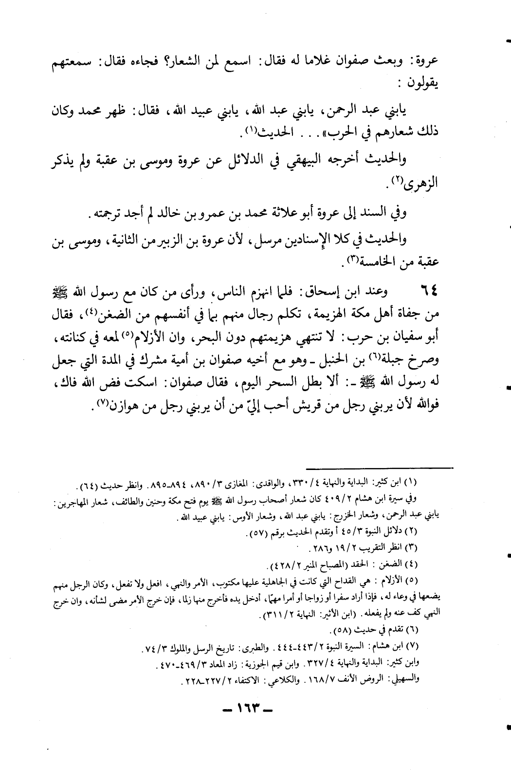 عروة: وبعث صفوان غلاماً له فقال: اسمع لمن الشعار؟ فجاءه فقال: سمعتهم يقولون: "يا بني عبد الرحمن، يا بني عبد الله، يا بني عبيد الله، فقال: ظهر محمد وكان ذلك شعارهم في الحرب" ... الحديث1.