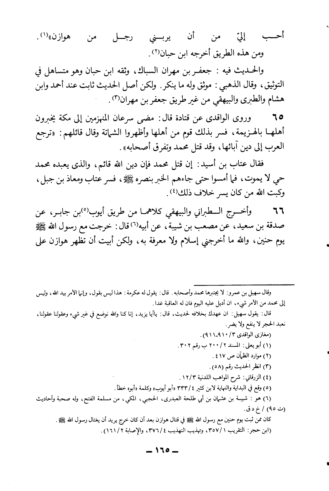 66- وأخرج الطبراني والبيهقي كلاهما من طريق أيوب5 بن جابر، عن صدقة بن سعد، عن مصعب بن شيبة، عن أبيه6 قال: خرجت مع رسول الله - صلى الله عليه وسلم - يوم حنين، والله ما أخرجني إسلام ولا معرفة به، ولكن أبيت أن تظهر هوازن على