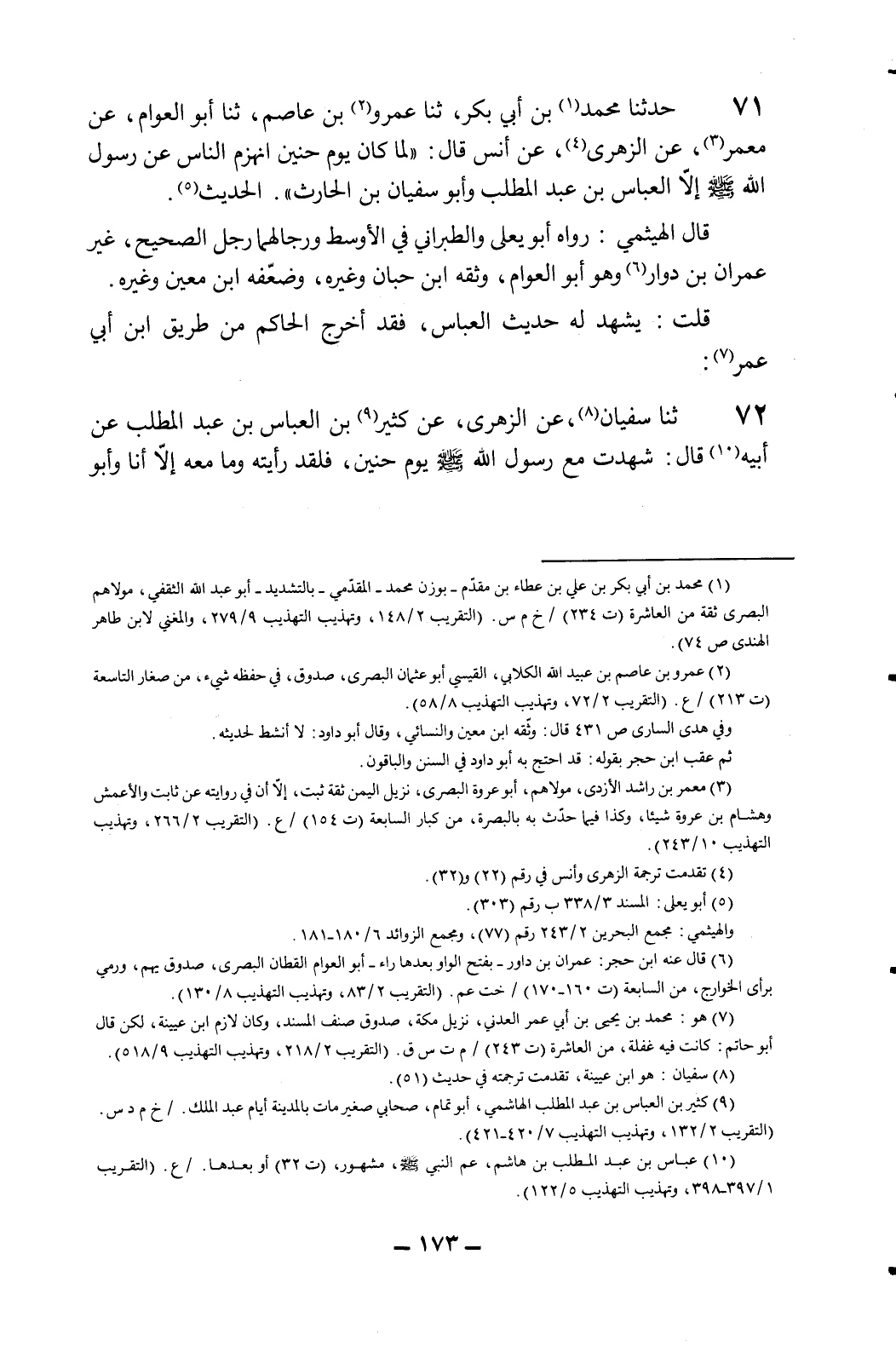 71- حدثنا محمد1 بن أبي بكر، ثنا عمرو2 بن عاصم، ثنا أبو العوام، عن معمر3، عن الزهري4، عن أنس قال: "لما كان يوم حنين انهزم الناس عن رسول الله - صلى الله عليه وسلم - إلاّ العباس بن عبد المطلب وأبو سفيان بن الحارث". الحديث5.