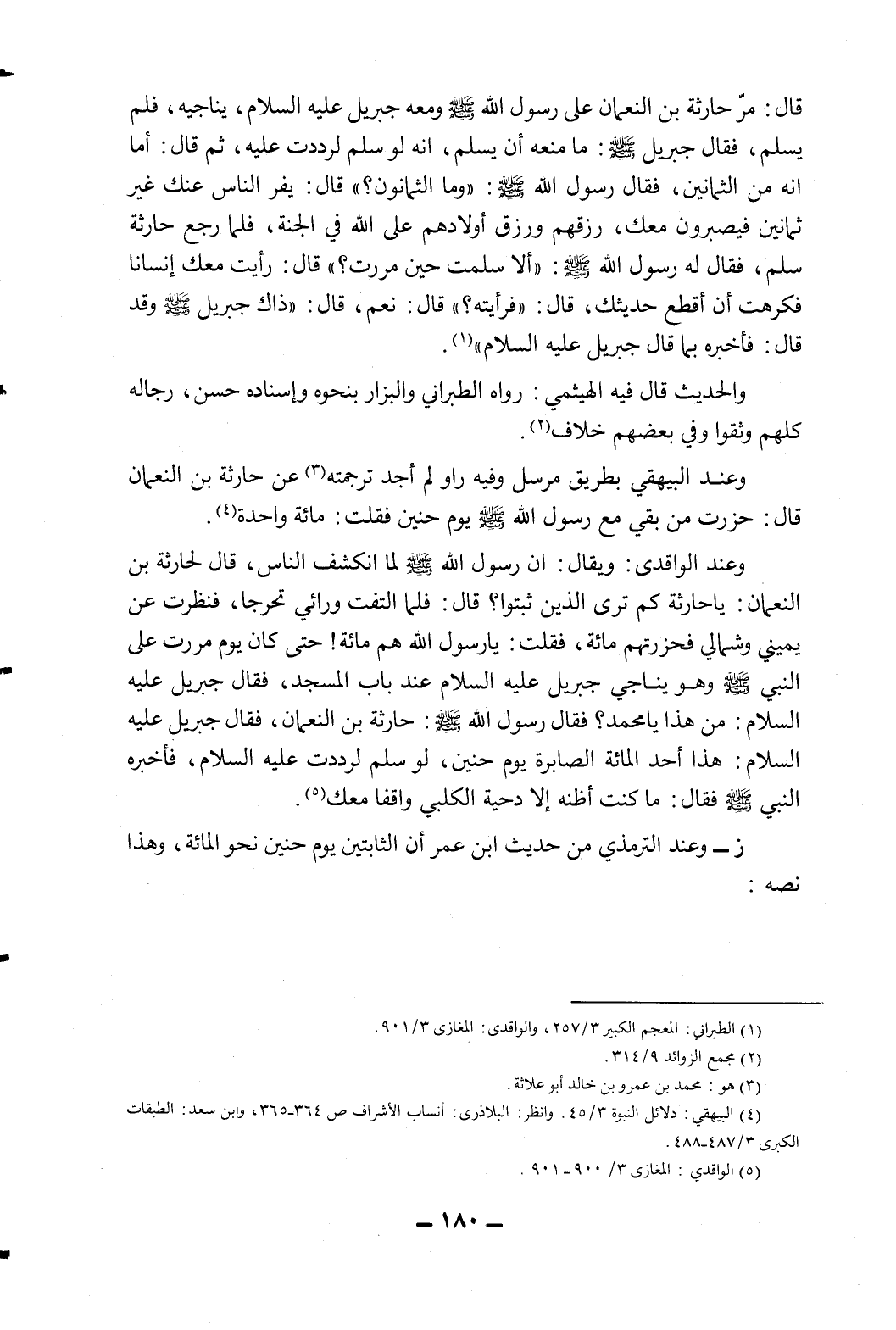 وعند الواقدي: ويقال: أن رسول الله - صلى الله عليه وسلم - لما انكشف الناس، قال لحارثة بن النعمان: "يا حارثة كم ترى الذين ثبتوا؟ قال: فلما التفت ورائي تحرجا، فنظرت عن يميني وشمالي فحزرتهم مائة، فقلت يا رسول الله هم مائة! حتى كان يوم مررت على النبي - صلى الله عليه وسلم - وهو يناجي جبريل عليه السلام عند باب المسجد، فقال جبريل - عليه السلام -: من هذا يا محمد؟ فقال رسول الله - صلى الله عليه وسلم -: حارثة بن النعمان، فقال جبريل - عليه السلام -: هذا أحد المائة الصابرة يوم حنين، لو سلم لرددت - عليه السلام -، فأخبره النبي - صلى الله عليه وسلم -، فقال: ما كنت أظنه إلا دحية الكلبي واقفا معك 5.