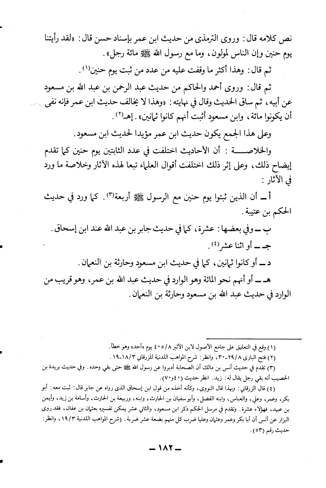 نص كلامه قال: وروى الترمذي من حديث ابن عمر بإسناد حسن قال: "لقد رأيتنا يوم حنين وإن الناس لمولون، وما مع رسول الله - صلى الله عليه وسلم - مائة رجل".