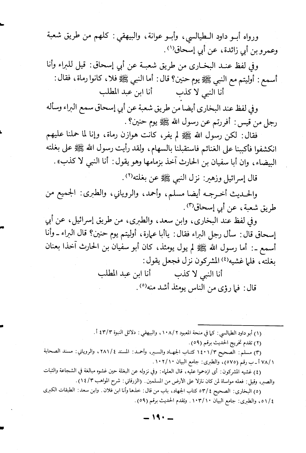 وفي لفظ عند البخاري، وابن سعد، والطبري، من طريق إسرائيل، عن أبي إسحاق قال: سأل رجل البراء فقال: يا أبا عمارة، أوليتم يوم حنين؟ قال البراء - وأنا أسمع -:أما رسول الله صلى الله عليه وسلم لم يول يومئذ، كان أبو سفيان بن الحارث آخذا بعنان بغلته، فلما غشيه4 المشركون نزل فجعل يقول: