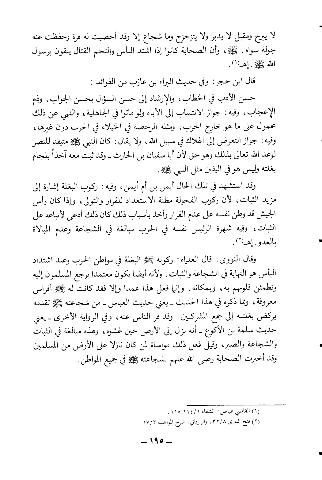 وقد استشهد في تلك الحال أيمن بن أم أيمن، وفيه: ركوب البغلة إشارة إلى كزيد الثبات، لأن ركوب الفحولة مظنة الاستعداد للفرار والتولي، وإذا كان رأس الجيش قد وطن نفسه على عدم الفرار وأخذ بأسباب ذلك كان ذلك أدعى لأتباعه على الثبات، وفيه شهرة الرئيس نفسه في الحرب مبالغة في الشجاعة وعدم المبالاة بالعدو. ا?2.