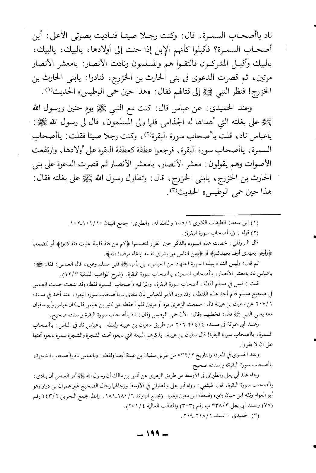 وعند أبي عوانة في مسنده4/204-206 من طريق سفيان بن عيينة ولفظه: يا عباس ناد في الناس: "يا أصحاب السمرة، يا أصحاب سورة البقرة! قال سفيان بن عيينة: يذكرهم البيعة التي بايعوه تحت الشجرة والشجرة سمرة بايعوه تحتها على أن لا يفروا".