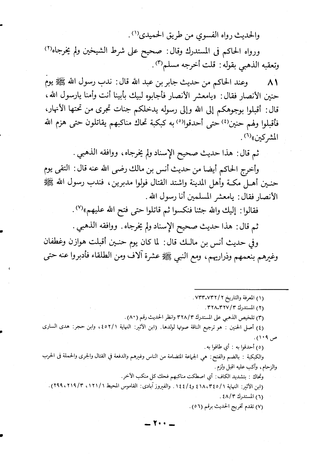 81- ونعد الحاكم من حديث جابر بن عبد الله قال: ندب رسول الله - صلى الله عليه وسلم - يوم حنين الأنصار فقال: "معشر الأنصار فأجابوه: لبيك، بأبينا أنت وأمنا يا رسول الله، قال: أقبلوا بوجوههم إلى الله وإلى رسوله يدخلكم جنات تجري من تحتها الأنهار، فأقبلوا ولهم حنين4 حتى أحدقوا5 به كبكبة تحاك مناكبهم يقاتلون حتى هزم الله المشركين" 6.