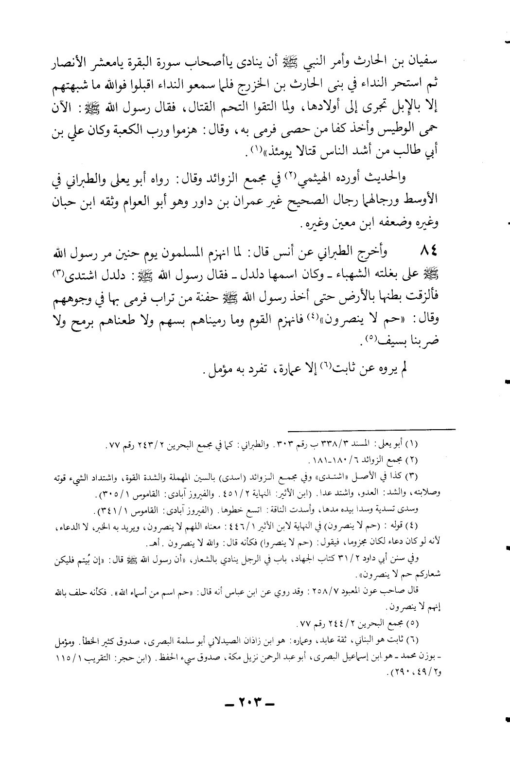 84- وأخرج الطبراني عن أنس قال: لنا انهزم المسلمون يوم حنين مر رسول الله - صلى الله عليه وسلم - على بغلته الشهباء - وكان اسمها دلدل - فقال رسول الله - صلى الله عليه وسلم -: دلدل اشتدي3 فألزقت بطنها بالأرض حتى أخذ رسول الله صلى الله عليه وسلم حفنة من تراب فرمى بها في وجوههم وقال: "حم لا ينصرون"4 فانهزم القوم وما رميناهم بسهم ولا طعناهم برمح ولا ضربنا بسيف 5.