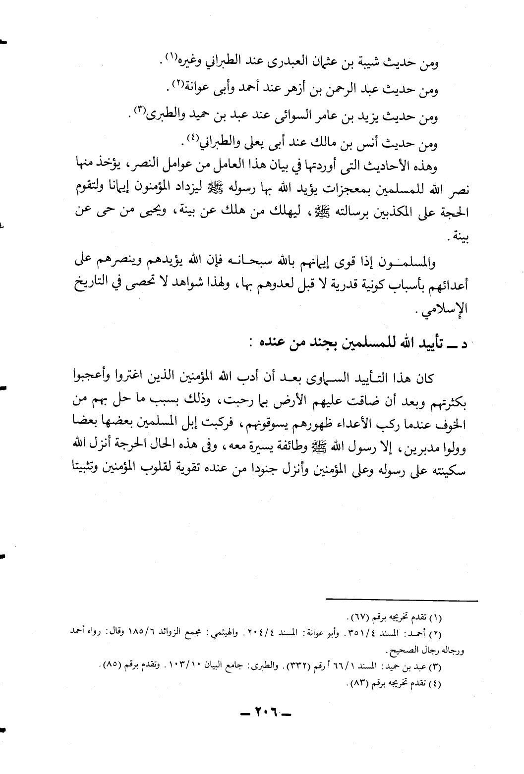 وهذه الأحاديث التي أوردتها في بيان هذا العامل من عوامل النصر، يؤخذ منها نصر الله للمسلمين بمعجزات يؤيد الله بها رسوله - صلى الله عليه وسلم - ليزيد المؤمنين إيمانا ولتقوم الحجة على المكذبين برسالته - صلى الله عليه وسلم -، ليهلك من هلك عن بينة، ويحيى من حي عن بينة.