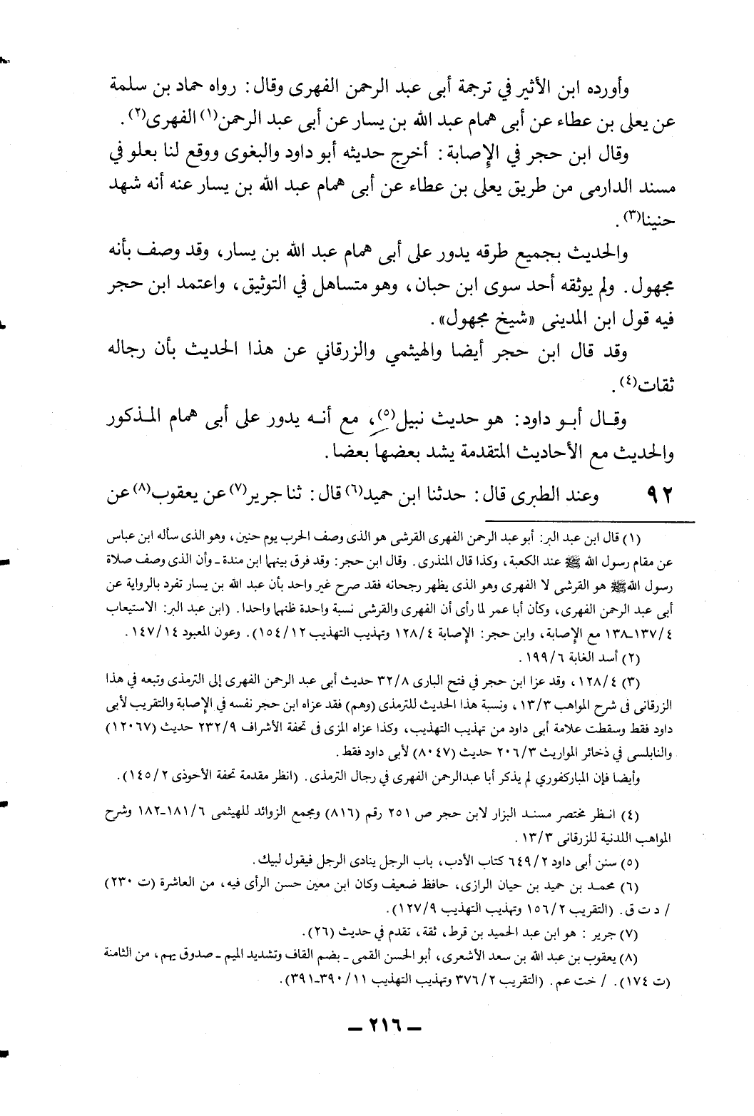 1 قال ابن عبد البر: "أبو عبد الرحمن الفهري القرشي هو الذي وصف الحرب يوم حنين، وهو الذي سأله ابن عباس عن مقام رسول الله صلى الله عليه وسلم عند الكعبة، وكذا قال المنذري. وقال ابن حجر: وقد فرق بينهما ابن مندة وأن الذي وصف صلاة رسول الله - صلى الله عليه وسلم - هو القرشي لا الفهري وهو الذي يظهر رجحانه فقد صرح غير واحد بأن عبد الله بن يسار تفرد بالرواية عن أبي عبد الرحمن الفهري، وكأن أبا عمر لما رأى أن الفهري والقرشي نسبة واحدة ظنهما واحدا". (ابن عبد البر: الاستيعاب 4/137- 138 مع الإصابة، وابن حجر: الإصابة 4/128 وتهذيب التهذيب 12/154) . وعون المعبود 14/147.
