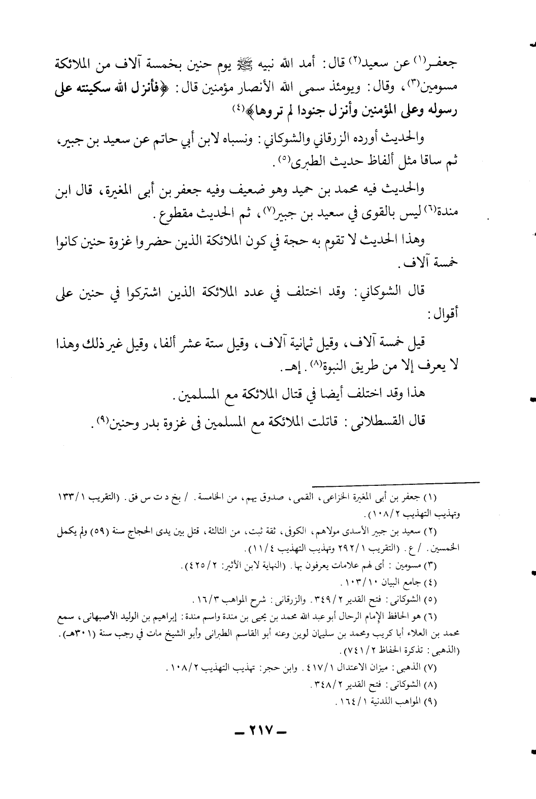 جعفر1 عن سعيد2 قال: أمد الله نبيه - صلى الله عليه وسلم - يوم حنين بخمسة آلاف من الملائكة مسومين3، وقال: ويومئذ سمى الله الأنصار مؤمنين قال: {فَأَنْزَلَ اللَّهُ سَكِينَتَهُ عَلَيْهِ وَأَيَّدَهُ بِجُنُودٍ لَمْ تَرَوْهَا} ، [سورة التوبة، من الآية:40] . 4.