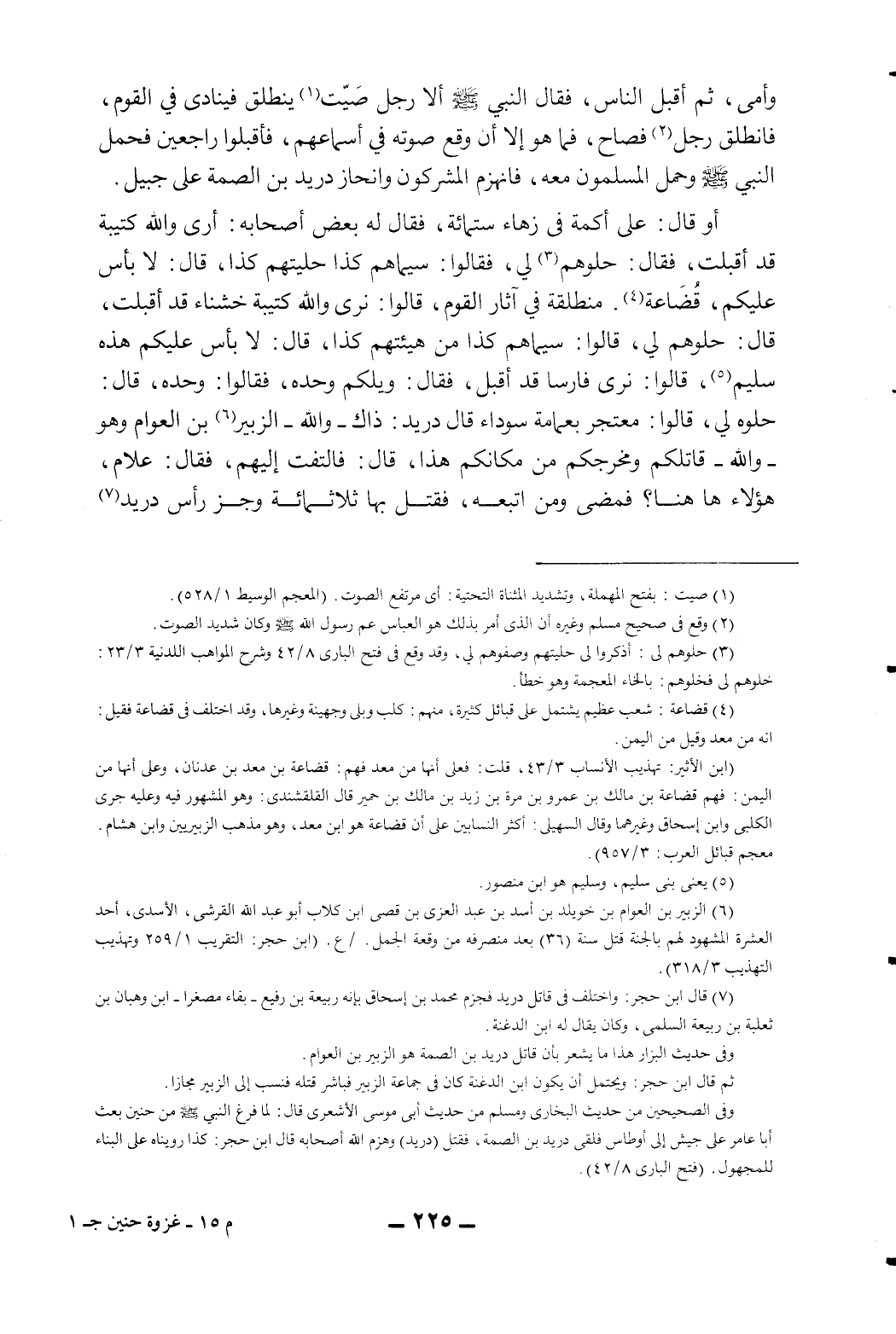 7 قال ابن حجر: "واختلف في قاتل دريد فجزم محمد بن إسحاق بأنه ربيعة بن رفيع-بالفاء مصغرا-ابن وهبان بن ثعلبة بن ربيعة السلمي، وكان يقال له ابن الدغنة". وفي حديث البزار هذا ما يشعر بأن قاتل دريد بن الصمة هو الزبير بن العوام.