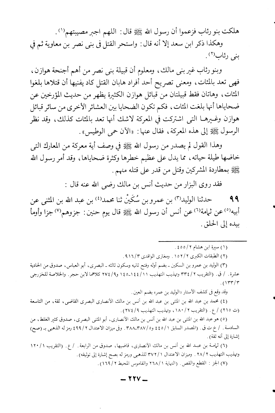 وبنو رئاب غير بني مالك، ومعلوم أن قبيلة بني نصر من أهم أجنحة هوازن، فهي تعد بالمئات، ومعنى تصريح أحد أفرادها بأن القتل كاد يفنيها أن قتلها بلغوا المئات، وهاتان فقط قبيلتان من قبائل هوازن الكثيرة يظهر من حديث المؤرخين عن ضحاياها أنها بلغت المئات، فكم تكون الضحايا بين العشائر الأخرى من سائر قبائل هوازن وغيرها التي اشتركت في المعركة لاشك أنها تعد بالمئات كذلك، وقد نظر الرسول - صلى الله عليه وسلم - إلى هذه المعركة، فقال عنها: "الآن حمي الوطيس".