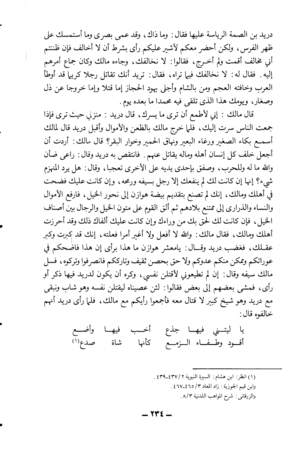 دريد بن الصمة الرياسة عليها فقال: "وما ذاك، وقد عمي بصري وما أستمسك على ظهر الفرس، ولكن أحضر معكم لأشير عليكم رأيي بشرط أن لا أخالف فإن ظننتم أني مخالف أقمت ولم أخرج، فقالوا: لا نخالفك، وجاءه مالك، وكان جماع مرهم إليه، فقال له: لا نخالفك فيما تراه، فقال: تريد أنك تقاتل رجلا كريما قد أوطأ العرب وخافته العجم ومن بالشام وأجلى يهود الحجاز إما قتلا وإما خروجا عن ذل وصغار، ويومك هذا الذي تلقى فيه محمدا ما بعده يوم".
