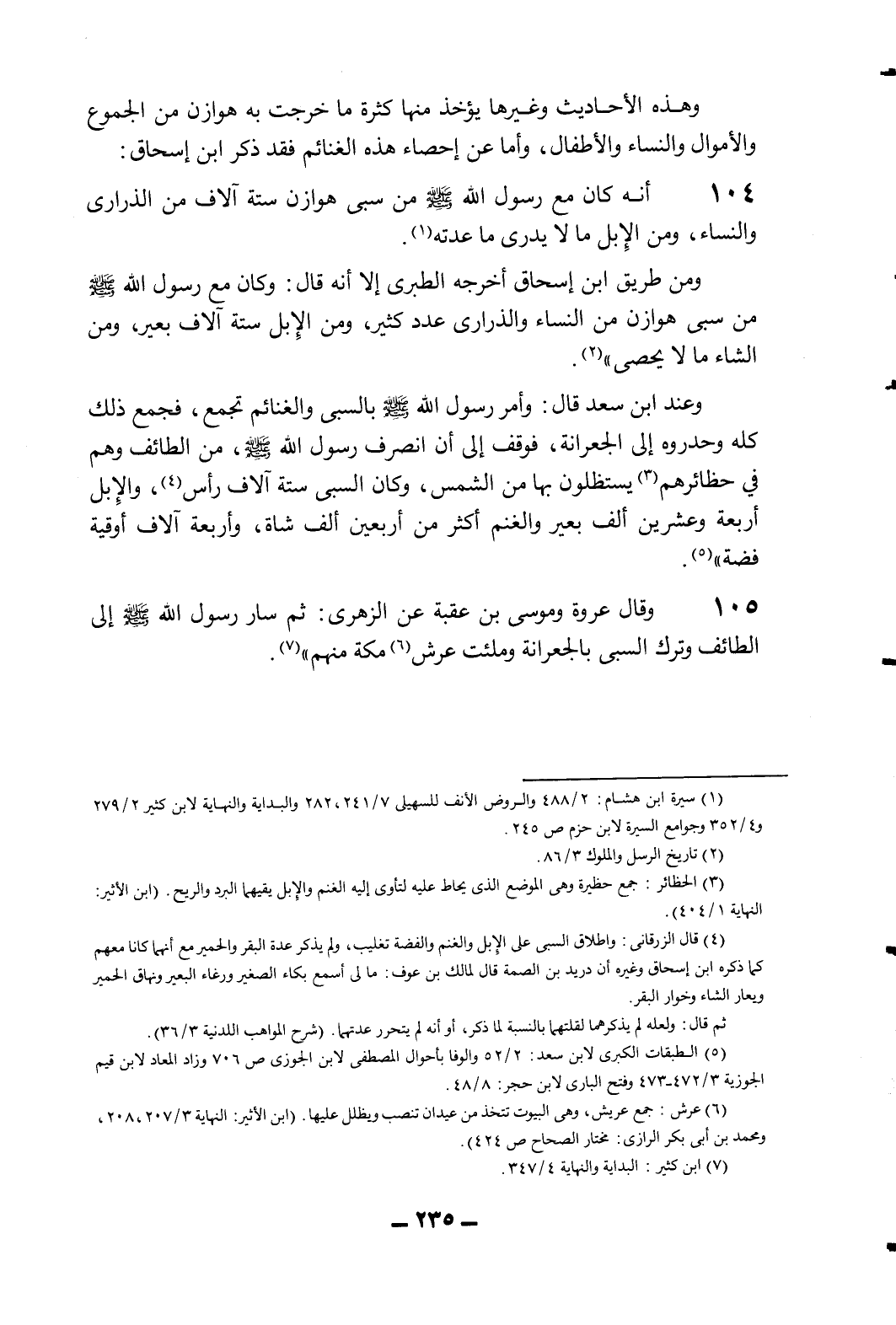 ومن طريق ابن إسحاق أخرجه الطبري إلا أنه قال: "وكان معه مع رسول الله صلى الله عليه وسلم من سبي هوازن من النساء والذراري عدد كثير، ومن الإبل ستة آلاف بعير، ومن الشاء ما لا يحصى" 2.