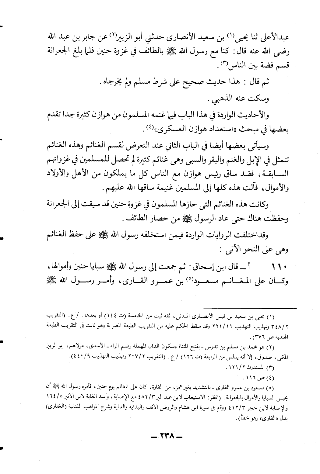 عبد الأعلى ثنا يحيى1 بن سعيد الأنصاري حدثني أبو الزبير2 عن جابر بن عبد الله رضي الله عنه قال: "كنا مع رسول الله صلى الله عليه وسلم بالطائف في غزوة حنين فلما بلغ الجعرانة قسم فضة بين الناس" 3.