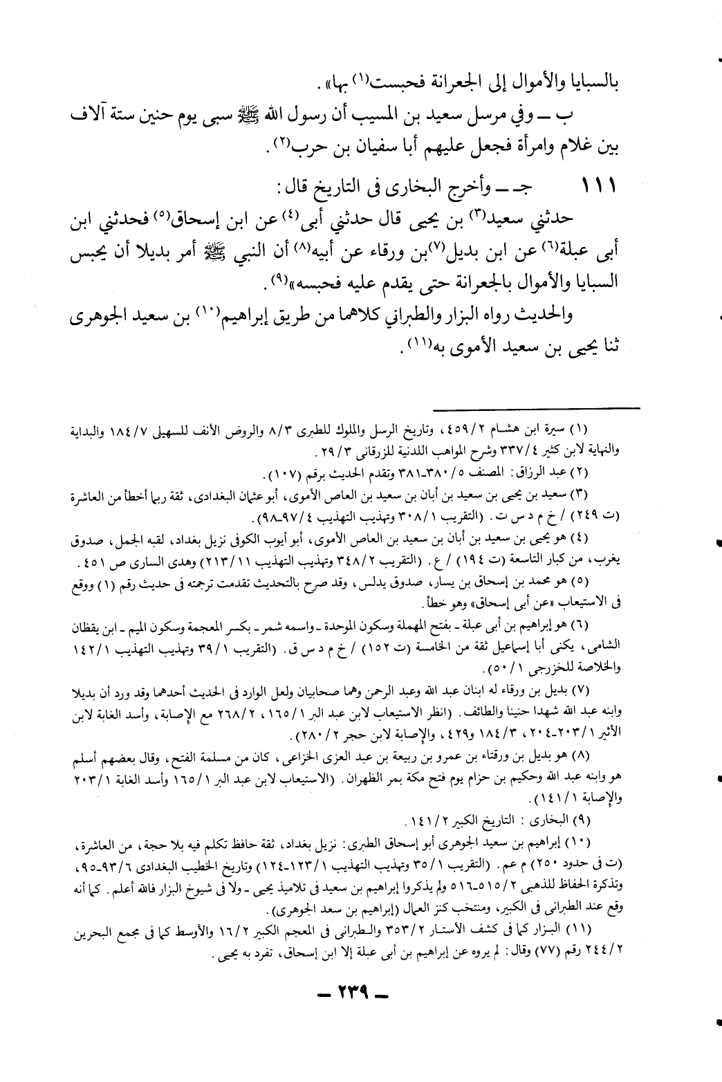 حدثني سعيد3بن يحيى قال حدثني أبي4عن ابن إسحاق5 فحدثني ابن أبي عبلة6 عن ابن بديل7 بن ورقاء عن أبيه8 أن النبي صلى الله عليه وسلم أمر بديلا أن يحبس السبايا والأموال بالجعرانة حتى يقدم عليه فحبسه" 9.