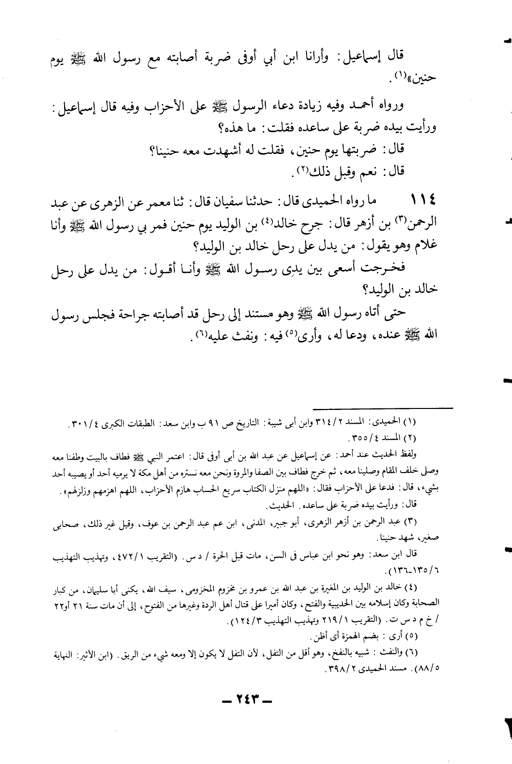 114- ما رواه الحميدي قال: حدثنا سفيان قال: ثنا معمر عن الزهري عن عبد الرحمن3 بن أزهر قال: جرح خالد4 بن الوليد يوم حنين فمر بي رسول الله صلى الله عليه وسلم وأنا غلام وهو يقول: "من يدل على رحل خالد بن الوليد؟ "