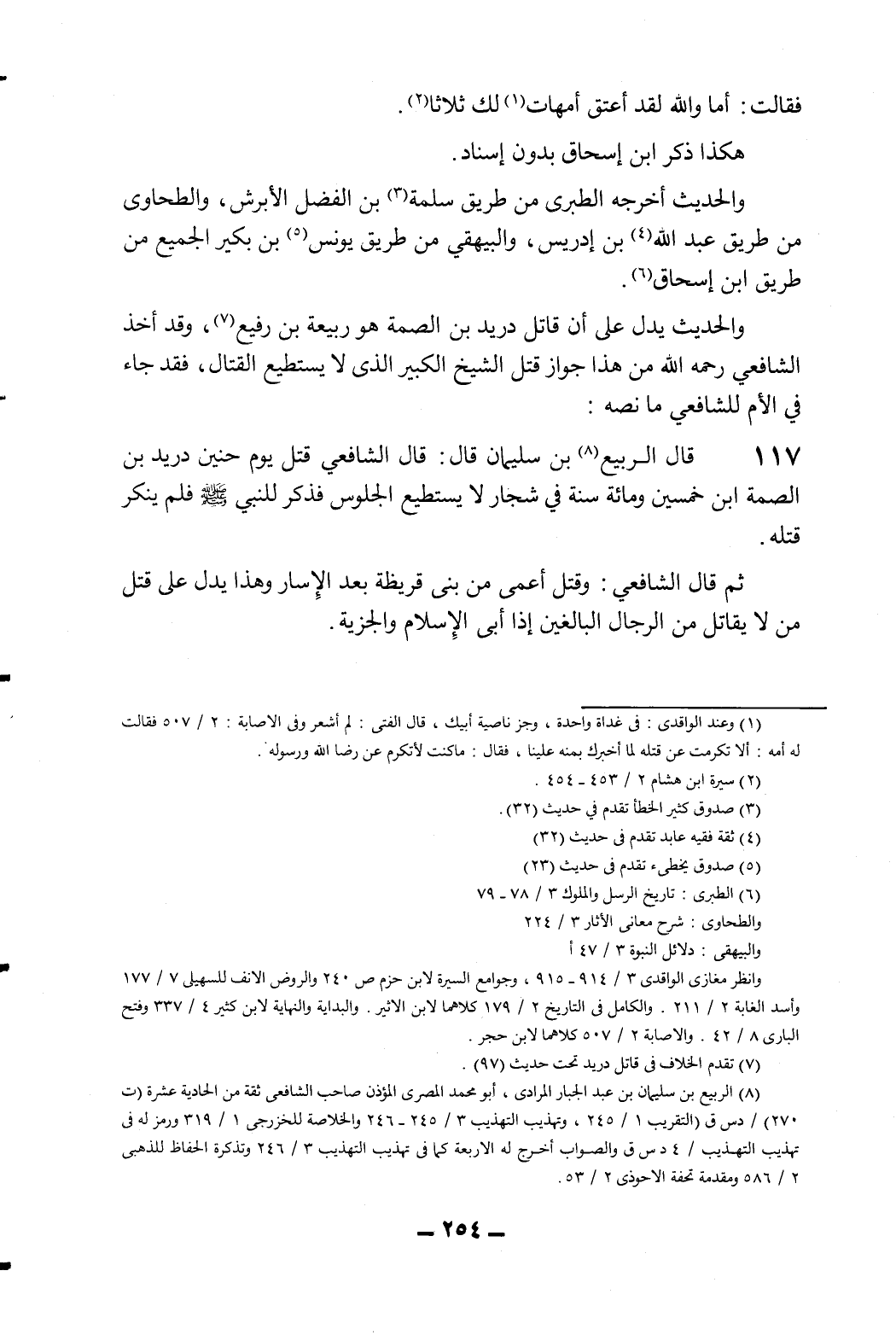 117- قال الربيع 8 بن سليمان قال: قال الشافعي قتل يوم حنين دريد بن الصمة ابن خمسين ومائة سنة في شجار لا يستطيع الجلوس فذكر للنبي صلى الله عليه وسلم فلم ينكر قتله.