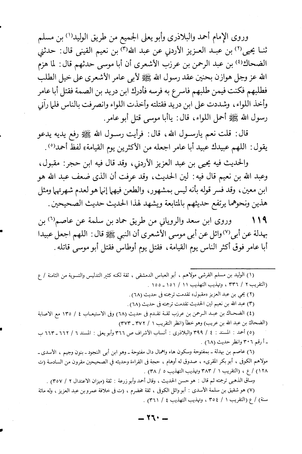 119 - وروى ابن سعد والروياني من طريق حماد بن سلمة عن عاصم6 بن بهدلة عن أبي7 وائل عن أبي موسى الأشعري أن النبيصلى الله عليه وسلم قال: "اللهم اجعل عبيدا أبا عامر فوق أكثر الناس يوم القيامة"، فقتل يوم أوطاس فقتل أبو موسى قاتله.