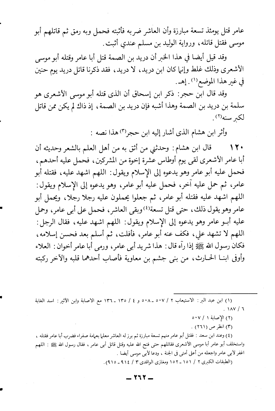 120- قال ابن هشام: وحدثني من أثق به من أهل العلم بالشعر وحديثه أن أبا عامر الأشعري لقي يوم أوطاس عشرة أخوة من المشركين، فحمل عليه أحدهم، فحمل عليه أبو عامر وهو يدعوه إلى الإسلام ويقول: اللهم اشهد عليه، فقتله أبو عامر، ثم حمل عليه آخر، فحمل عليه أبو عامر، وهو يدعوه إلى الإسلام ويقول: "اللهم أشهد عليه" فقتله أبو عامر، ثم جعلوا يحملون عليه رجلا رجلا، ويحمل أبو عامر وهو يقول ذلك، حتى قتل تسعة4 وبقي العاشر، فحمل على أبي عامر، وحمل عليه أبو عامر وهو يدعوه إلى الإسلام ويقول: "اللهم أشهد عليه"، فقال الرجل: "اللهم لا تشهد علي"، فكف عنه أبو عامر، فأفلت، ثم أسلم بعد فحسن إسلامه، فكان رسول الله صلى الله عليه وسلم إذا رآه قال: "هذا شريد أبي عامر"، ورمى أبا عامر أخوان: العلاء وأوفى ابنا الحارث، وبني جشم بن معاوية فأصاب أحدهما قلبه والآخر ركبته