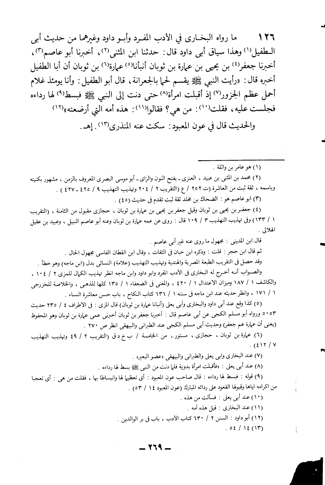 126- ما رواه البخاري في الأدب المفرد وأبوداود وغيرهما من حديث أبي الطفيل1 وهذا سياق أبي داود قال: حدثنا ابن المثنى2، أخبرنا أبوعاصم3، أخبرنا جعفر4 بن يحيى بن عمارة بن ثوبان